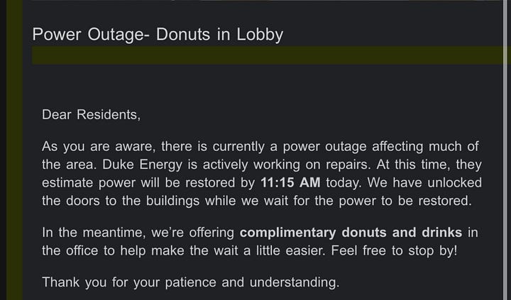 There was an 18-hour power outage in our area because of a downed line. Our apartment complex uses electrical fobs, and we got locked out of our building. Mind you, this was a random Monday night. Our apartment complex’s property manager had the ability to override the system and unlock all the exterior doors. Did they do that? Nope. Not until the middle of the day the next day. They brought apology donuts, though.